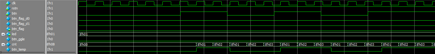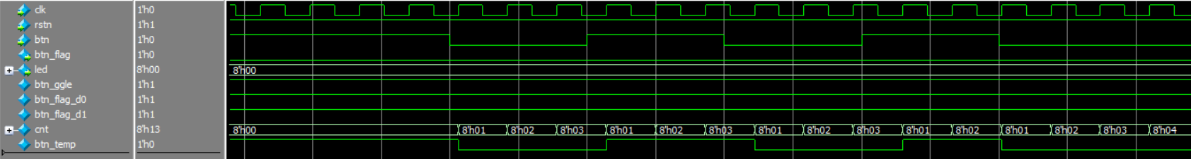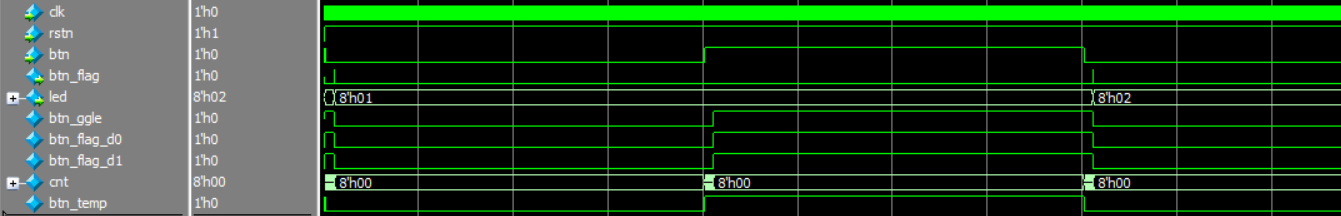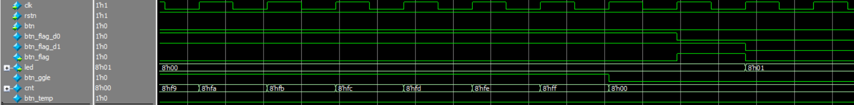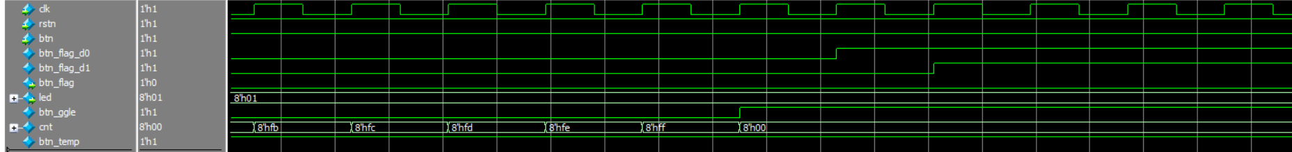 从波形三和四中,我们可以看到,当模拟按键抬起时(0 ----> 1cnt重新计数,直到稳定,cnt计数到8’hFF时,更新btn_ggle,由于按键是抬起,btn_flag不变,led不变。