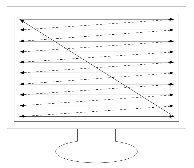 如上图所示,每一帧图像都是从左上角开始,逐行扫描形成,所以规定最左上角的像素点为第一个像素点,坐标是(0,0) ,以这个像素为起点,向右 x 坐标逐渐增大,向下 y 坐标逐渐增大,重复若干次后扫描到右下角完成一帧图像的扫描,扫描完成后进行图像消隐,随后指针跳回左上角重新进行新一帧的扫描。