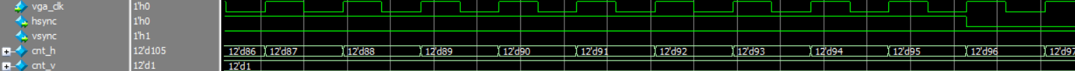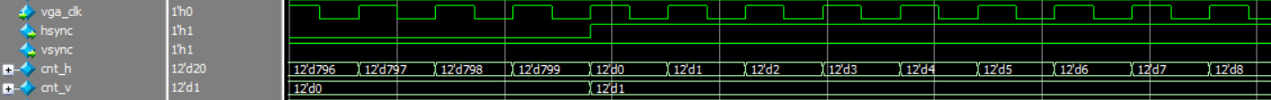 从图 11 和 12 中我们可以看到当 cnt_h 信号计数结束后会恢复 0 ,cnt_v 会加一,hsync 信号会拉高 96 个像素时钟(0~95)cnt_h 和 hsync 与设计相符。