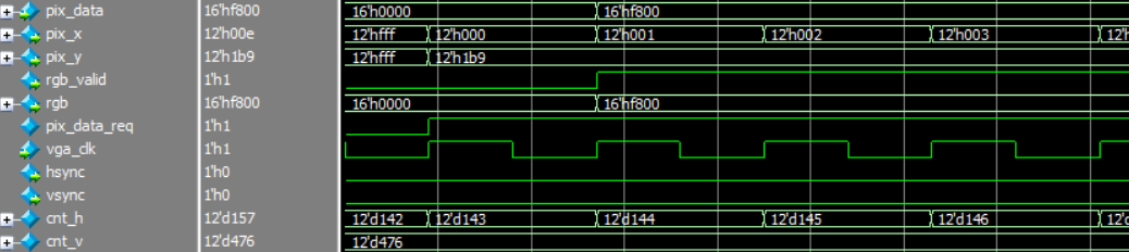 如图 13 所示,当 cnt_h 计数到 H_SYNC + H_BACK + H_LEFT ,也就是 144 时,rgb_valid 拉高,xy 轴坐标比 rgb_valid 提前一个时钟周期,以便 pix_data 准备好数据,符合设计。