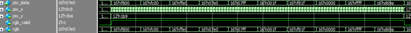 从每一行看,每一行被分成了 10 个部分,每部分像素数据分别对应不同颜色,符合设计要求。可以进行下一步上板验证。