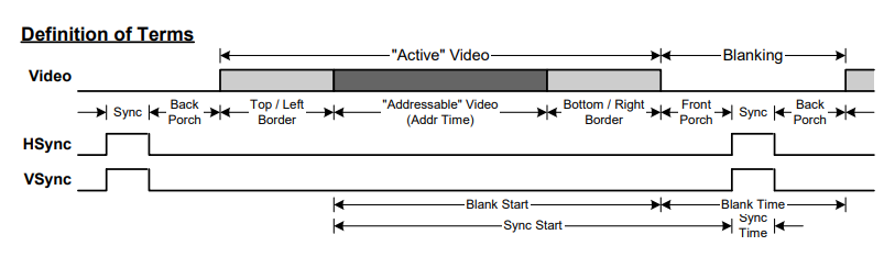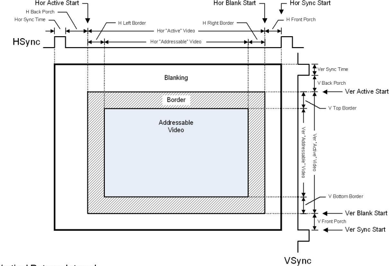 行同步的一个扫周期要经过 6 个部分,分别是 Sync (同步) 、 Back Porch(后沿) 、 Left Border(左边框) 、 “Addressable” Video(有效图像) 、 Right Border(右边框) 、 Front Porch(前沿) ,这些过程的长度都是以像素为单位的,也就是以像素时钟为单位,例如 Sync 的值为 96 ,也就意味着 Sync 阶段要经历 96 个像素时钟。HSync 信号会在 Sync 同步阶段拉高(不同的芯片可能有不同标准)以确定新一行的开始与上一行的结束。而完整的一行像素很多,但有效的真正能显示在屏幕上的像素只有 “Addressable” Video(有效图像)部分的像素,其他阶段的像素均无效,无法显示在屏幕中。