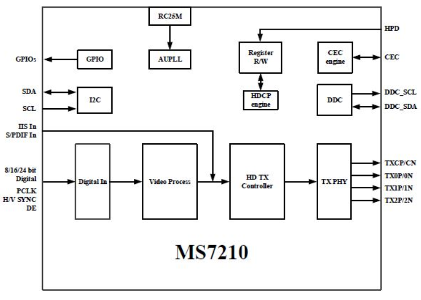 MS7210 芯片可以通过 IIC 协议对内部寄存器进行配置,有关芯片寄存器配置需要向芯片厂家进行申请。