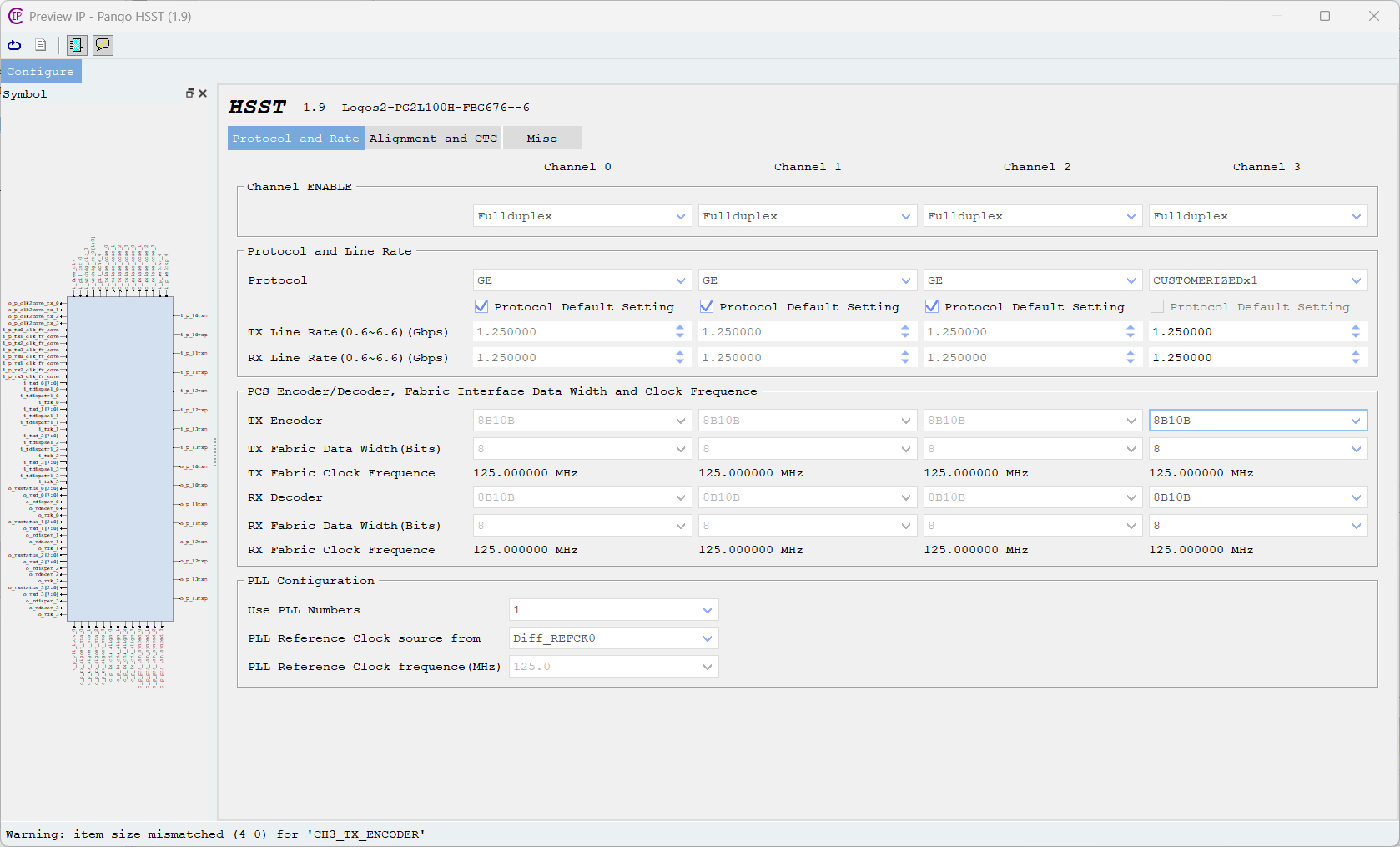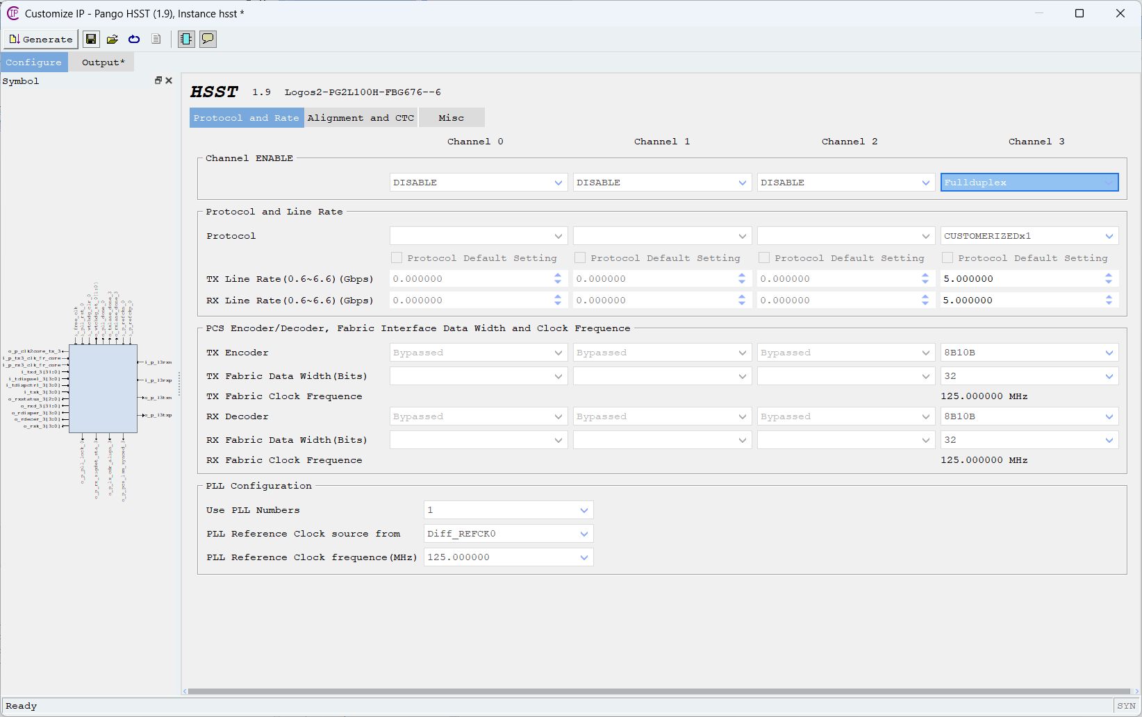 在本次实验中,我们将通道 3 设置成全双工,自定义协议,线速率 5Gbps,编码选择 8b10b,传输和接收的数据长度选择 32 位,PLL 的参考时钟为 125M。配置图如下:
