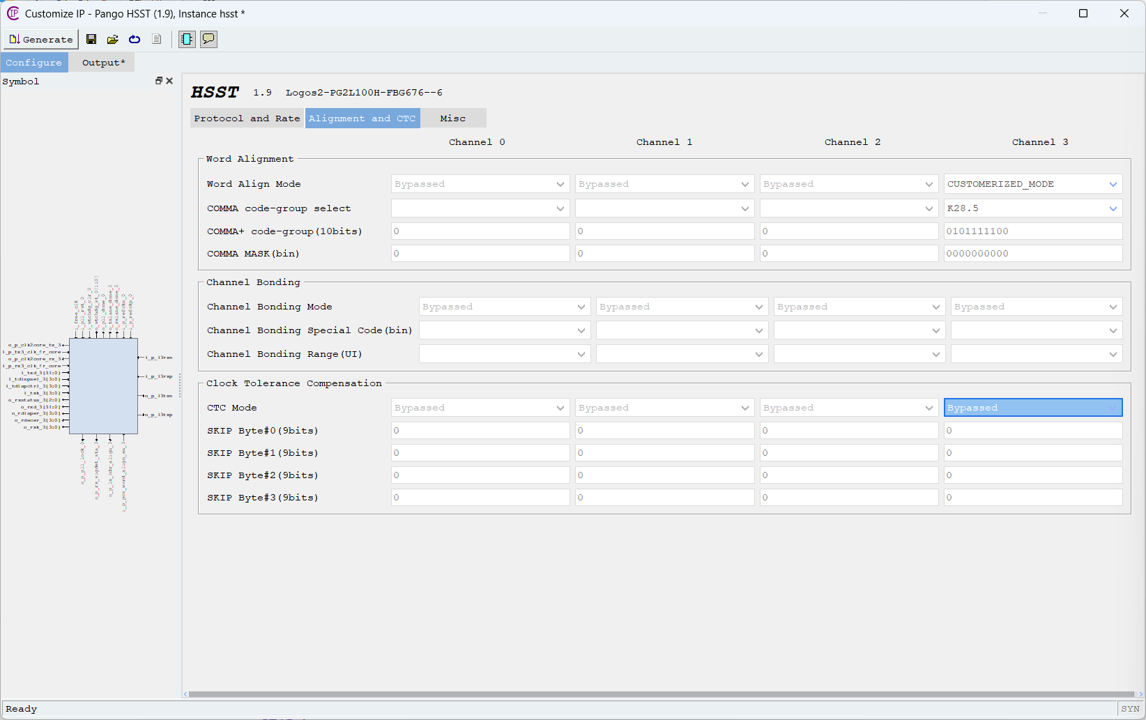 在 Alignment 界面,可以配置对齐(word alignment)的模式,对齐所用的 K 码,多通道绑定(channel bonding)的模式,以及高速传输时出现的时钟偏差补偿(Clock Tolerance Compensation),具体使用可以参考 hsst 手册。