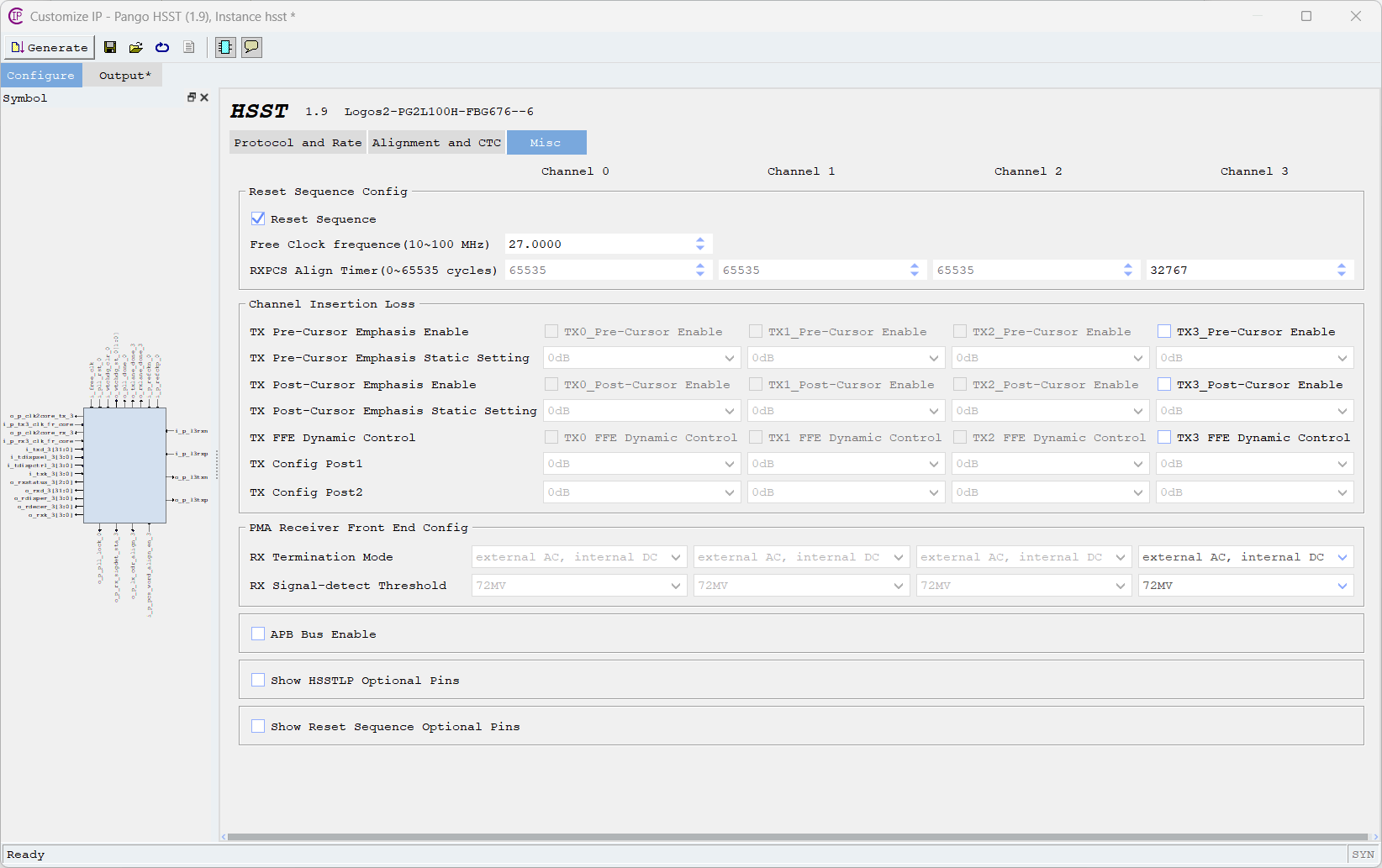 在 Misc 界面选择使用官方复位程序,参考时钟 27M(板载时钟),复位时钟个数为 32767,接收模式(RX Termination Mode)选择外部 AC,内部 DC。配置如下图所示:
