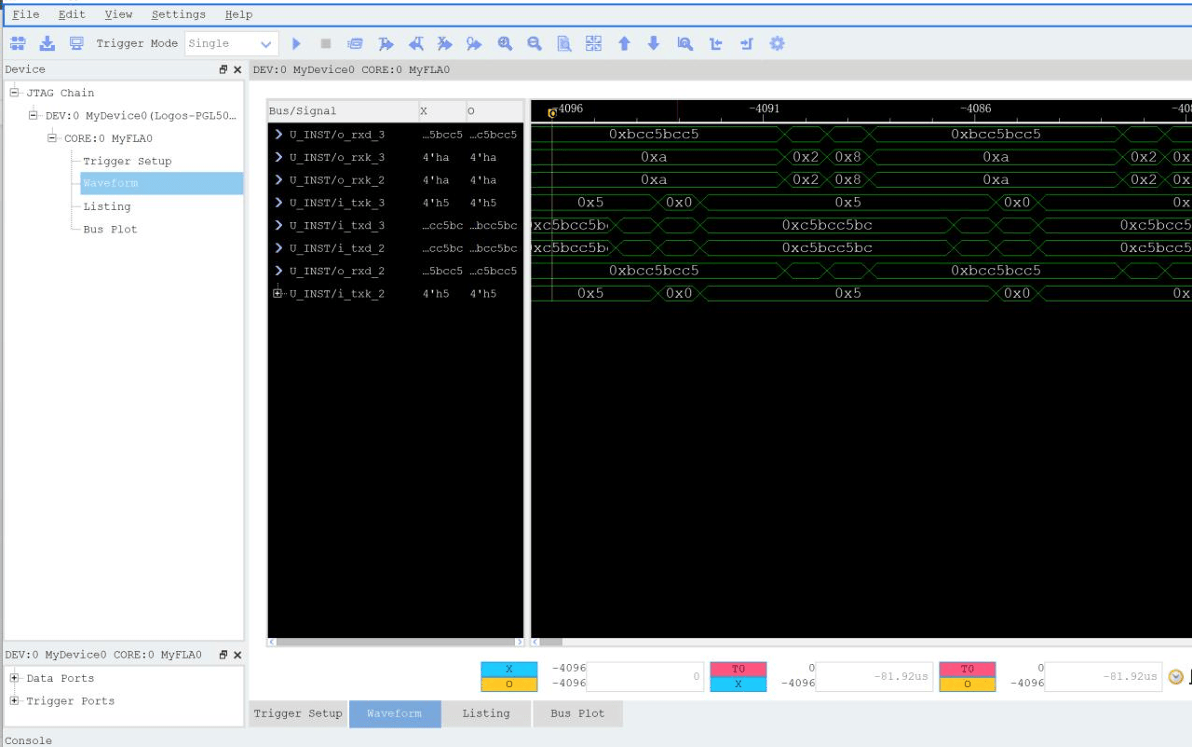 完成管脚分配之后就可以生成 sbit 文件,将文件提交到网站后点击烧录,即可将 sbit 下载到实验板中,在摄像头页面即可观察到 8 个 led 中前四个亮,后四个分别为不亮,不亮,亮,不亮的状态。前四个亮表示 hsst 中 pll 和 rx,tx 通道初始化成功,最后两个 led,led1 亮表示接收的与发送的数据相同,led0 不亮表示未经 32 位对齐模块处理的接收数据与发送数据不同。